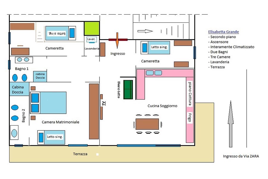 Situato al secondo piano di una palazzina con ascensore, a soli 50 metri da via Dante e 200 metri dal mare. È presente un'area all'ingresso dov'è possibile lasciare i passeggini.