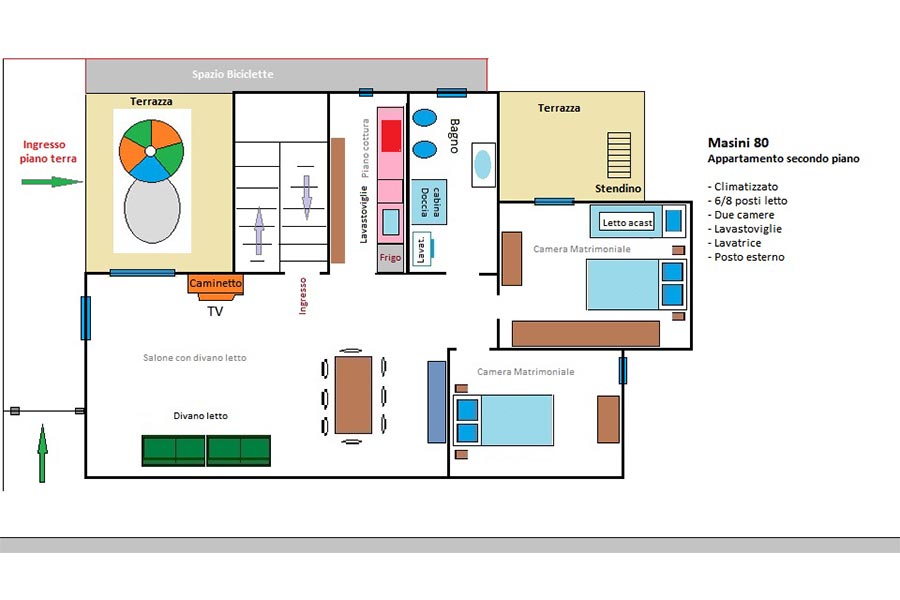 - 3 camere, una matrimoniale più un letto, una cameretta con due letti singoli e una cameretta con letto singolo. È inoltre possibile aggiungere nella matrimoniale un lettino da campeggio.
